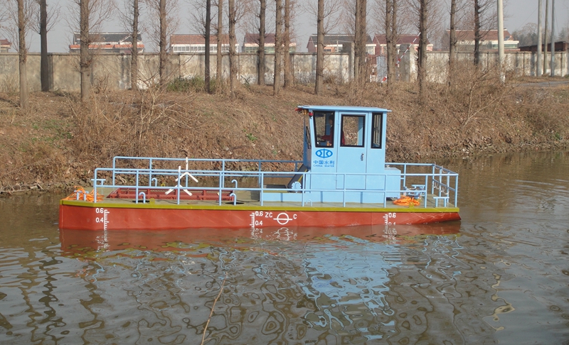 本船为垃圾半自动打捞船,船头两边尖,中间开口,中间为垃圾收集舱,行驶时垃圾向中间仓内进,主要用于打捞收集河面普通漂浮垃圾,适合城区河道、小型水库,该船收集范围广,既能清扫体积较大、长形的漂浮垃圾(如树枝、塑料瓶等),又能清扫体积较小的,成片的漂浮垃圾(如绿萍、塑料袋、树叶等)